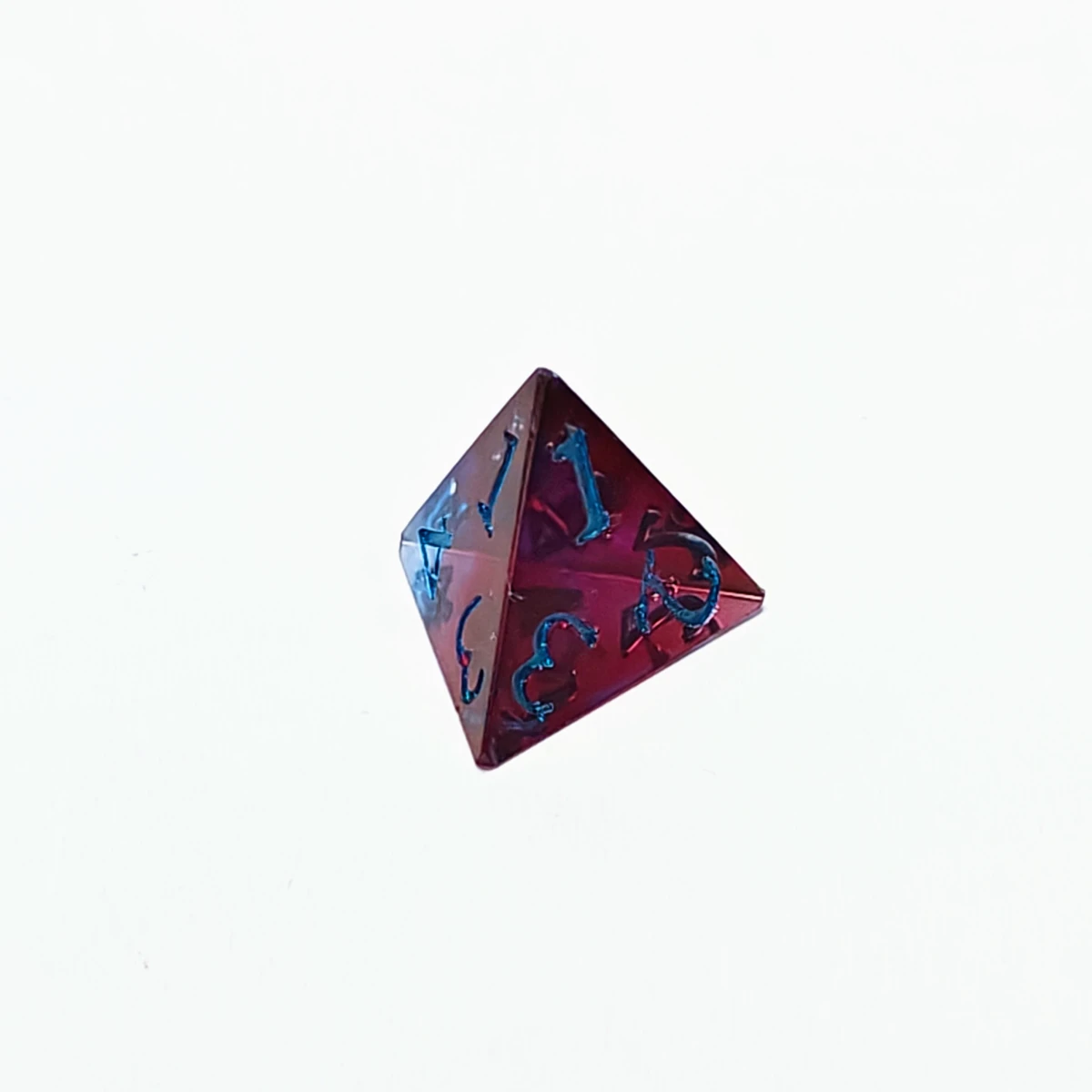 A flavorful (lookng) set of sharp odds. This dice set is a translucent burgundy resin with teal swirls and mettalic blue numbers. Edges and corners are sharp (not rounded). They contain minor imperfections and/or bubbles (indicated in individual images).