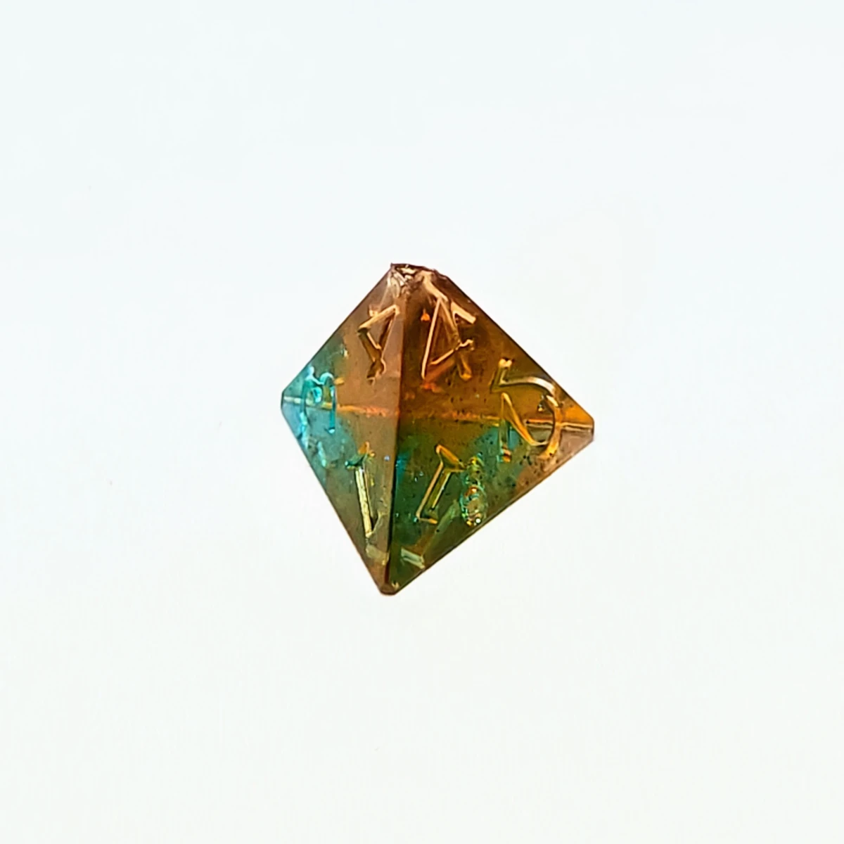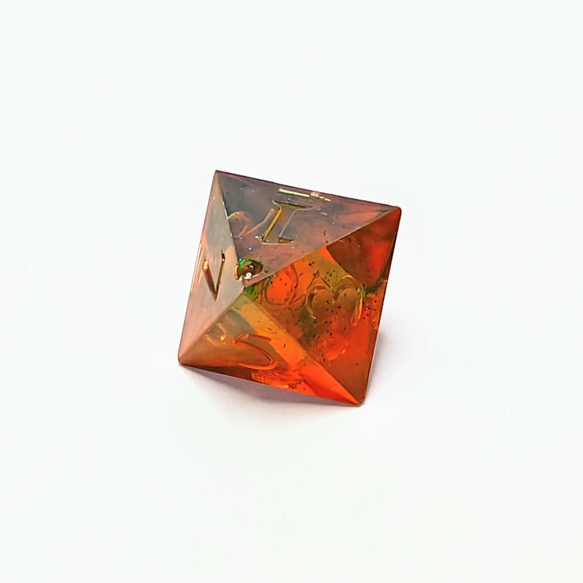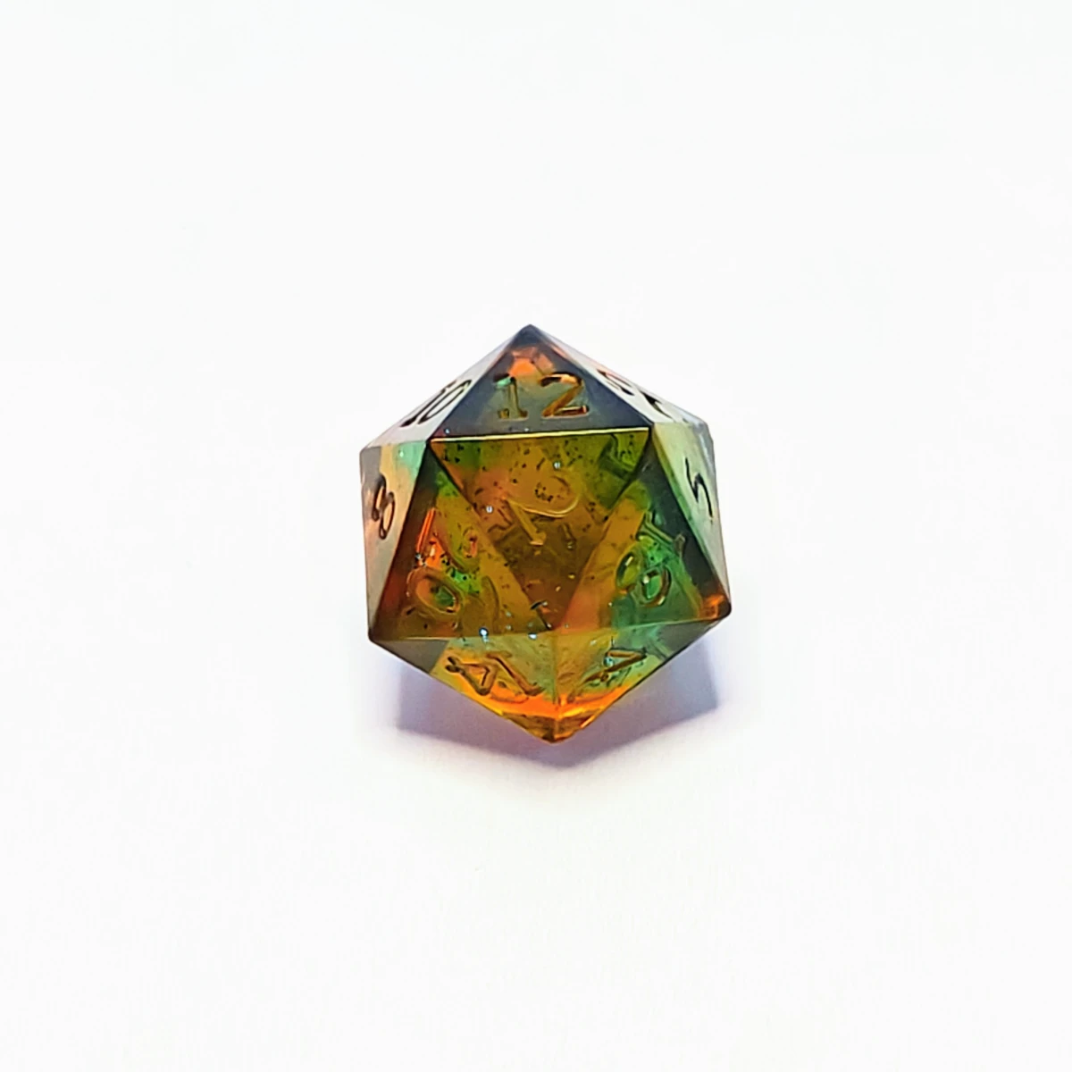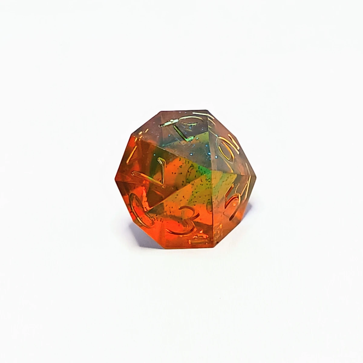 Feathers fly with this swirl of Caribbean color. These dice combines an orange translucent resin with green swirls, green metallic flakes, and clear numbers. The corners and edges have been smoothed (not sharp). They contain some minor imperfections and bubbles, as noted in individual images.