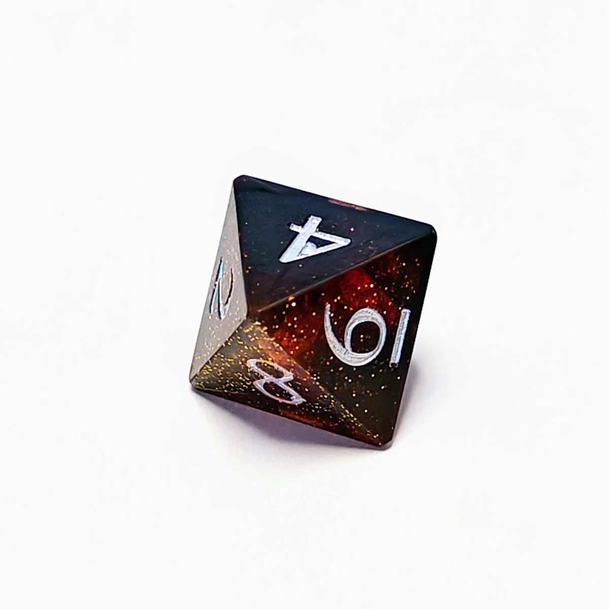 Magic flows through the depths of space. These dice combine a dark brown translucent resin with yellow swirl, gold mettalic flakes, and metallic silver numbers. The corners and edges have been smoothed. Metallic flakes tended to cluster more on one end of each die. They contain some minor imperfections and bubbles, as noted in individual images.
