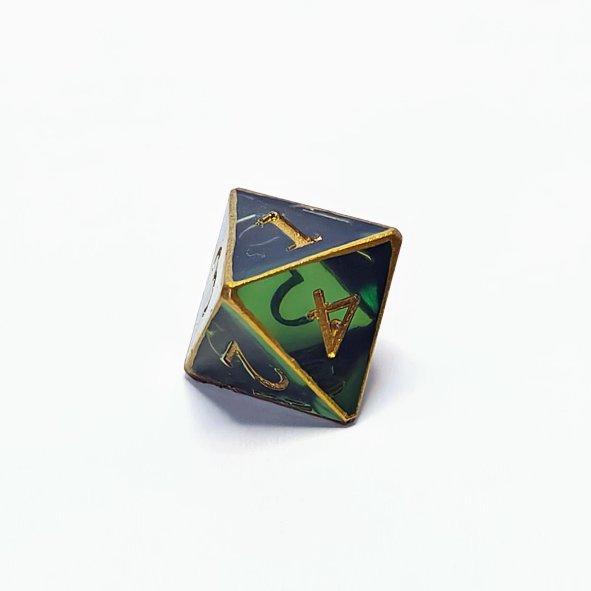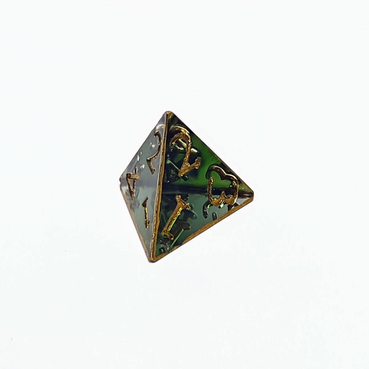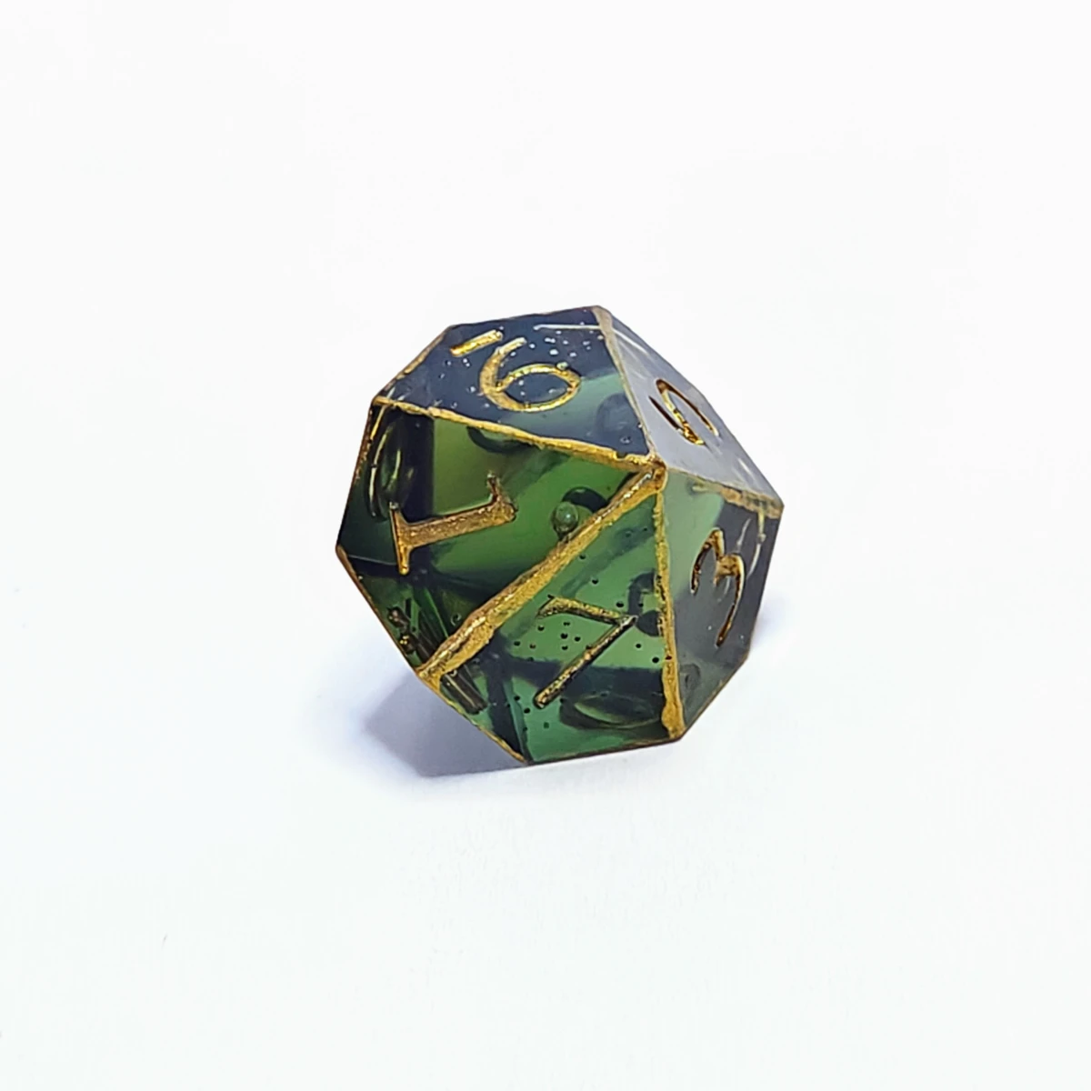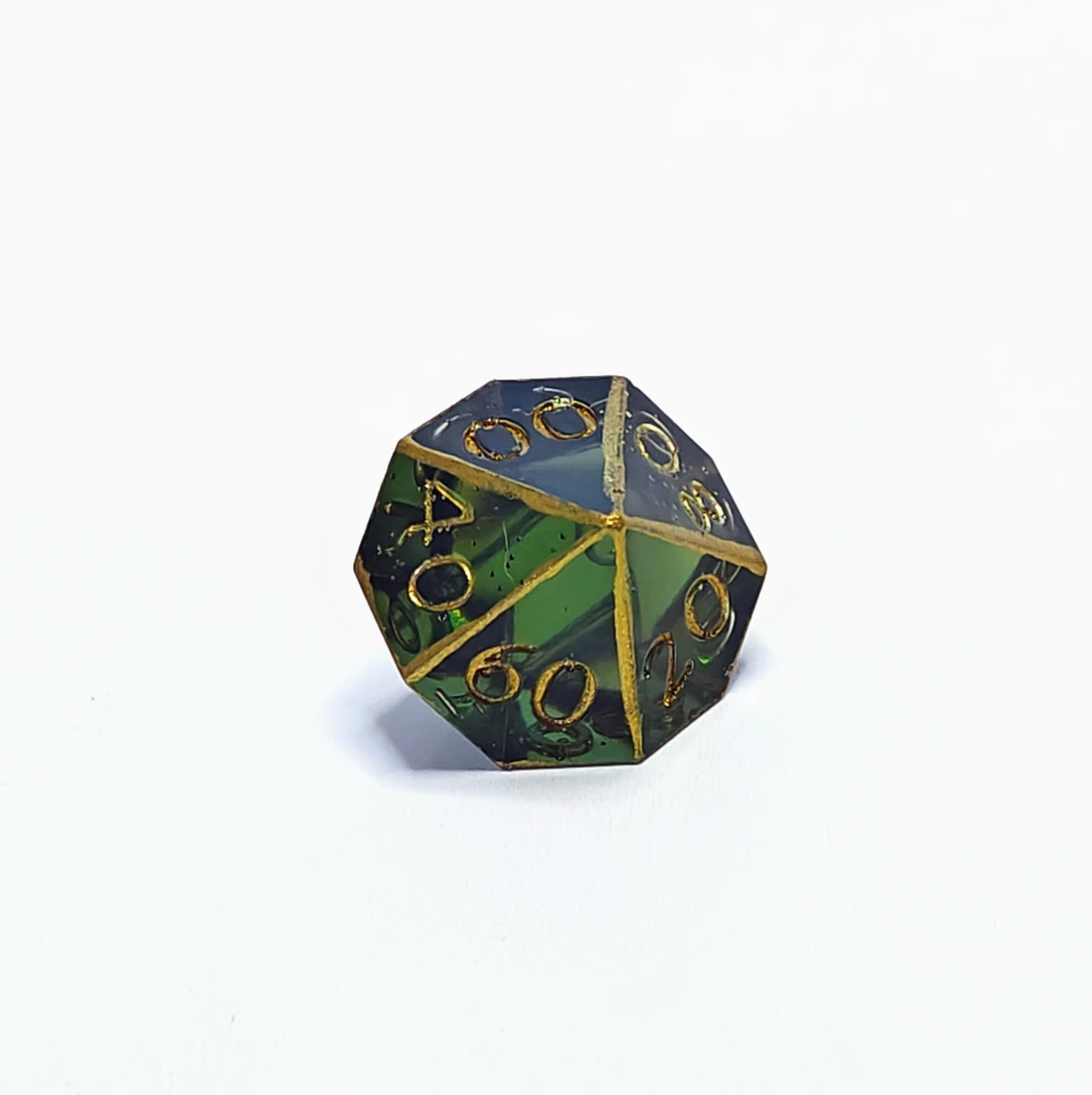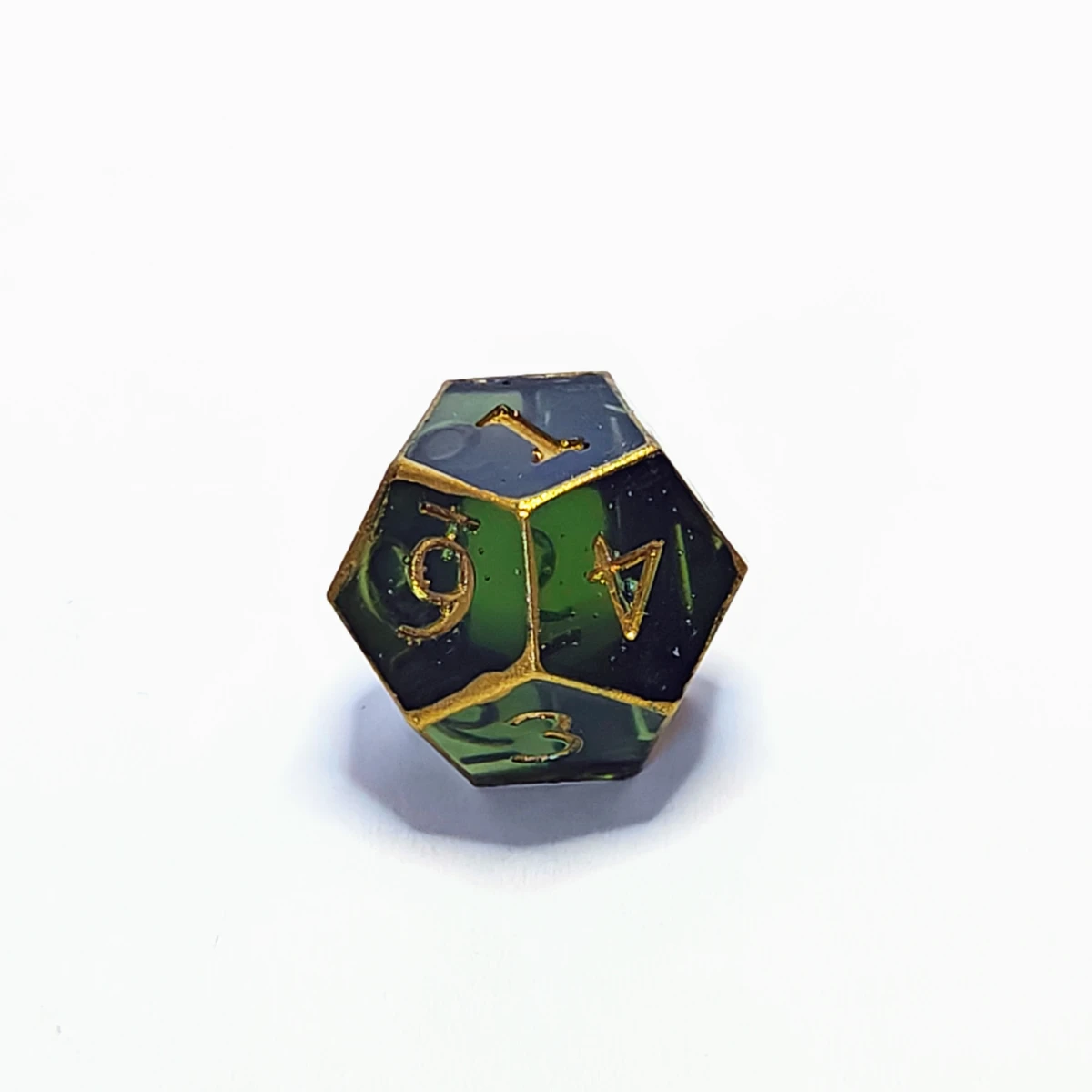 The colors of the high elves, found in a sylvan glade. Dark green translucent resin with metallic gold numbers and edges. Corners and edges are smoothed. They contain minor imperfections and/or bubbles (indicated in individual images).