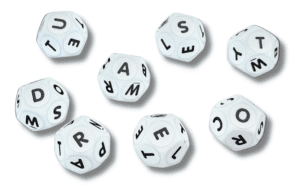 1. Team 1 takes the dice and assigns a scribe for that turn (someone to write down the words and score them). They shake the dice in the bag and pour them onto the table.