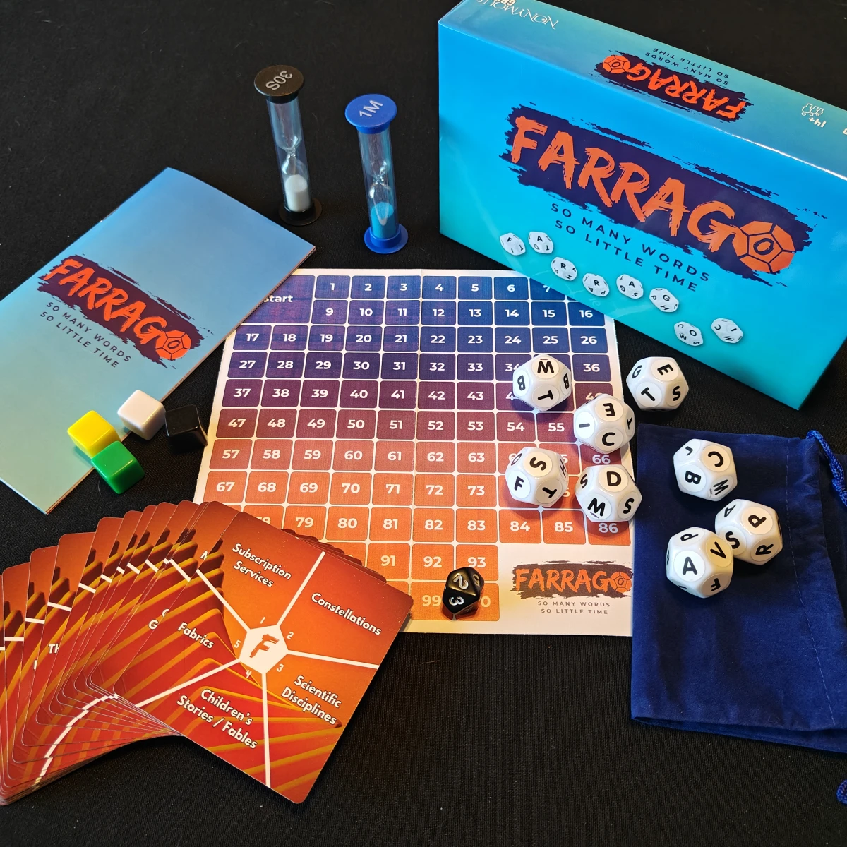 Farrago is a word game of quick thinking and trivia, creating a hodgepodge of answers, and driving your scribe crazy as they write it all down! Each turn you have 60 seconds to come up with one answer for each of the lettered dice that fits the assigned topic. If you don't manage to get answers for all eight dice, the other team gets a chance to steal points by coming up with answers for those dice in the same topic. The team with the highest score after four rounds wins!