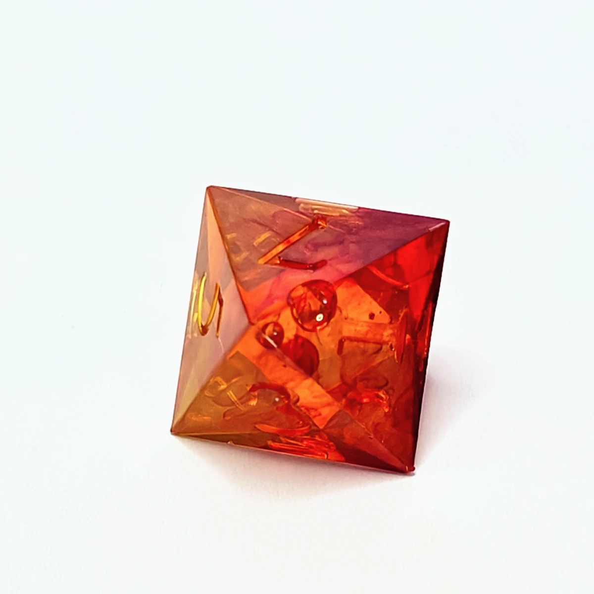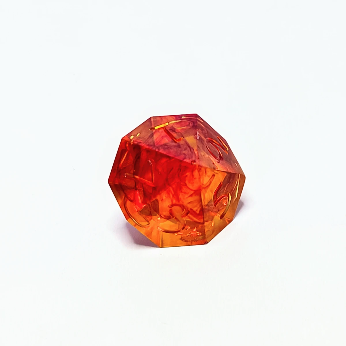 Feel the heat as you cast fireball for the hundredth time this D&D session. Translucent resign combined yellow, fire opal, and red swirls. Clear numbers, with sharp corners and edges (not rounded). They contain minor imperfections and/or bubbles (indicated in individual images).